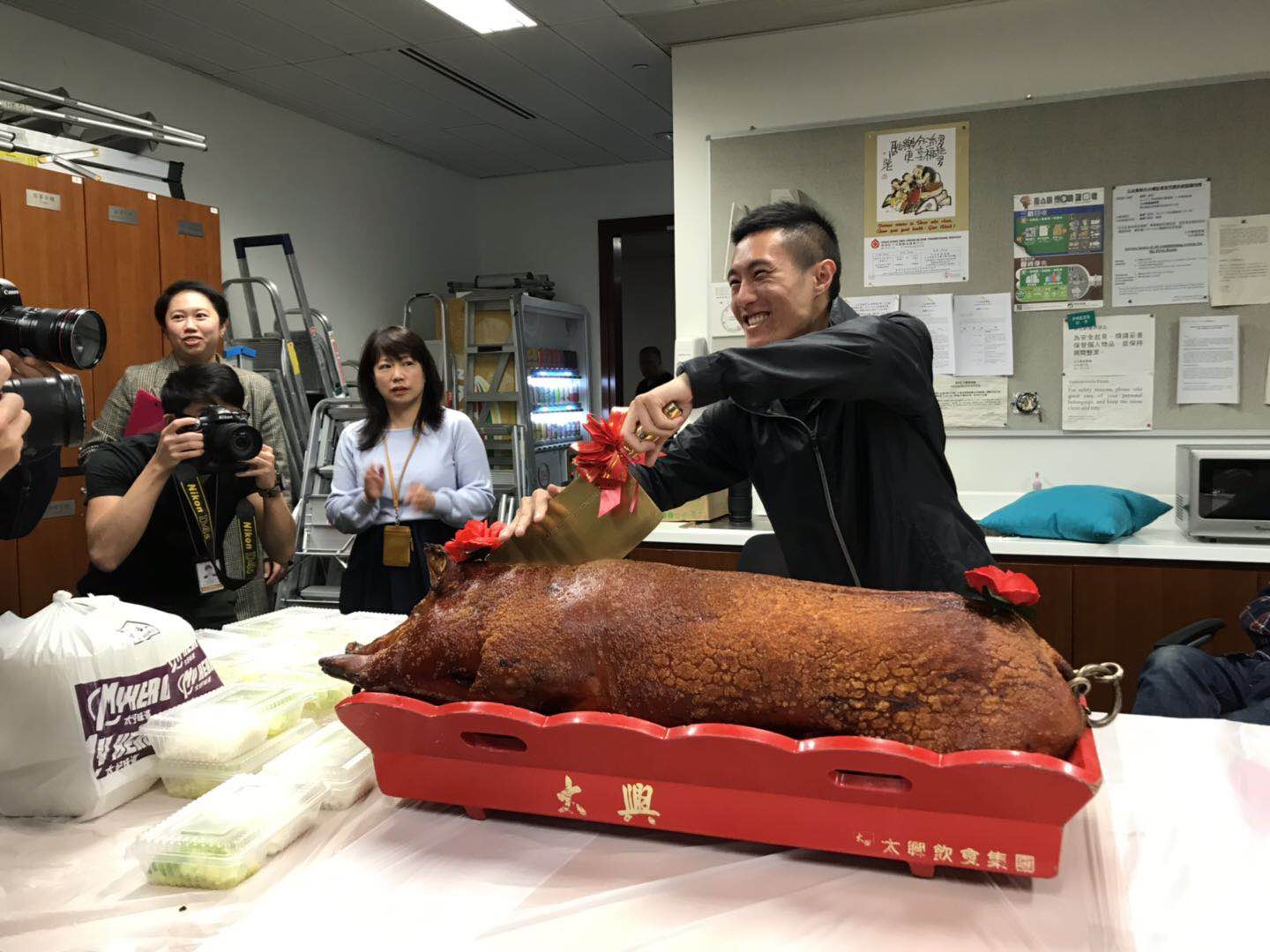 只可惜,宴會正式開始之後,一眾記者便被工作人員禮貌請出了宴會廳,沒有機會拍下高官及議員們大快朵頤的畫面。不過,記者們也不必失落,立法會特地在立法會記者室為到場的記者們準備了一頭肥嫩的燒乳豬,記者們亦邀請自己的“新聞界立法會主席”為大家切燒豬,期望新的一年肥肥美美。只是不知,平時總是將長槍短炮對準別人的“主席”,自己成爲本港新聞界焦點的時候,心情是什麽樣的呢?(新媒體記者 劉深)