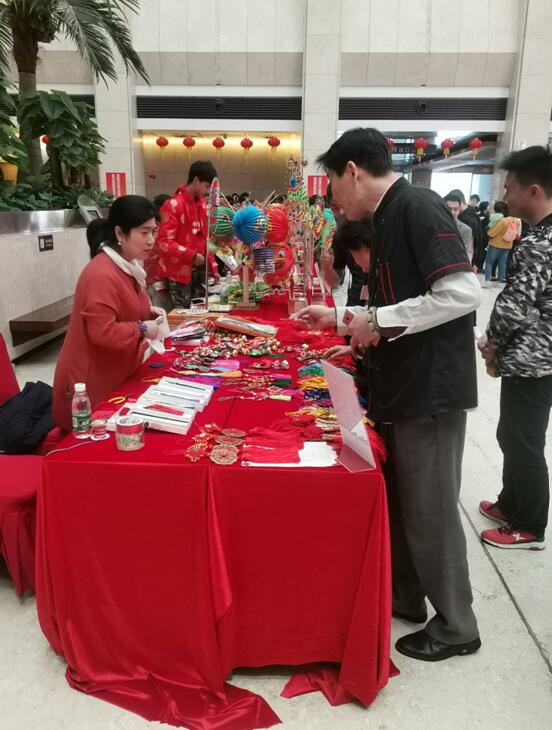 在展楼东出口旁设置有免费品尝汤圆的摊位,一楼南北侧安排了猜灯谜活动。此外,一系列非遗及传统手工技艺展示出现在活动现场,剪纸、面塑、草编工艺和风车技艺等民间艺人各施其技。