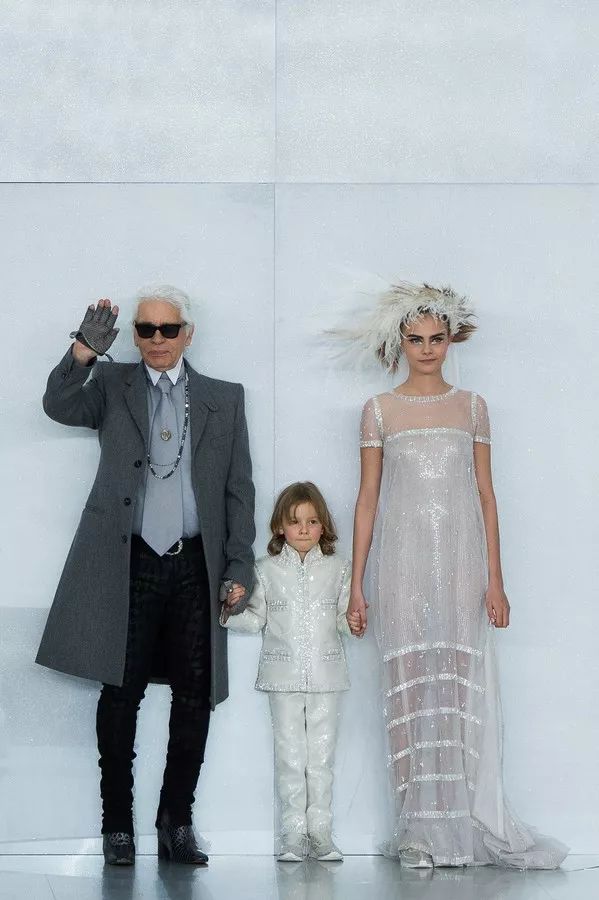 历次举办大秀的时候,Karl Lagerfeld都会手挽心爱的模特为大秀谢幕。