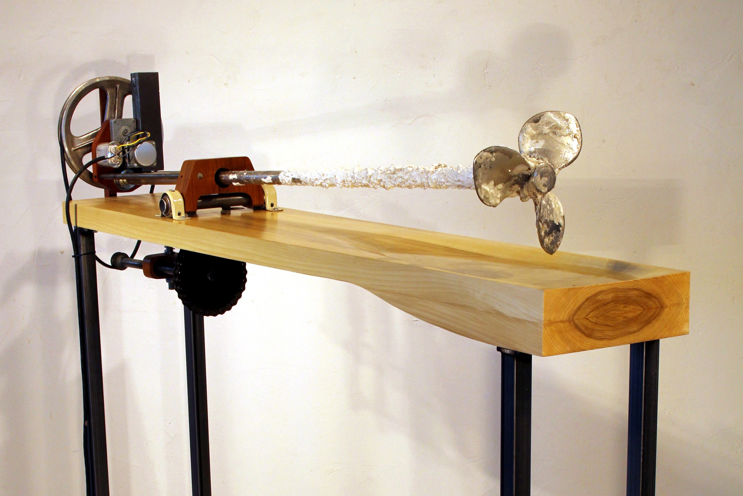 © Michael Fadel, 前方或者没有方向, 2017, 螺旋桨, 水, 木材, 机械元件, 122 x 162.5 x 27.9 cm© Michael Fadel, 不醒, 2017, 钢珠, 橄榄油, 金属盘, 机械元件, 25.4 x 81.2 x 81.2 cm