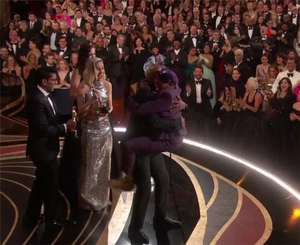 首次获奖的斯派克·李激动地跳到塞缪尔·杰克逊身上...