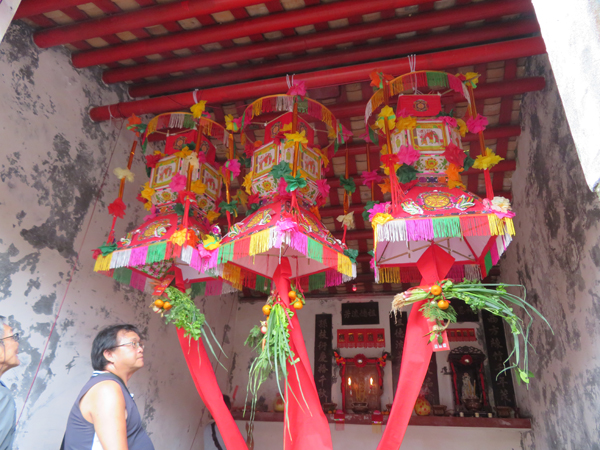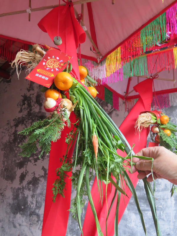色彩斑斕的花燈,其下掛了慈菇、紅包、松柏、紅蘿蔔、葱、芹、桔、九個銅錢,各有寓意。