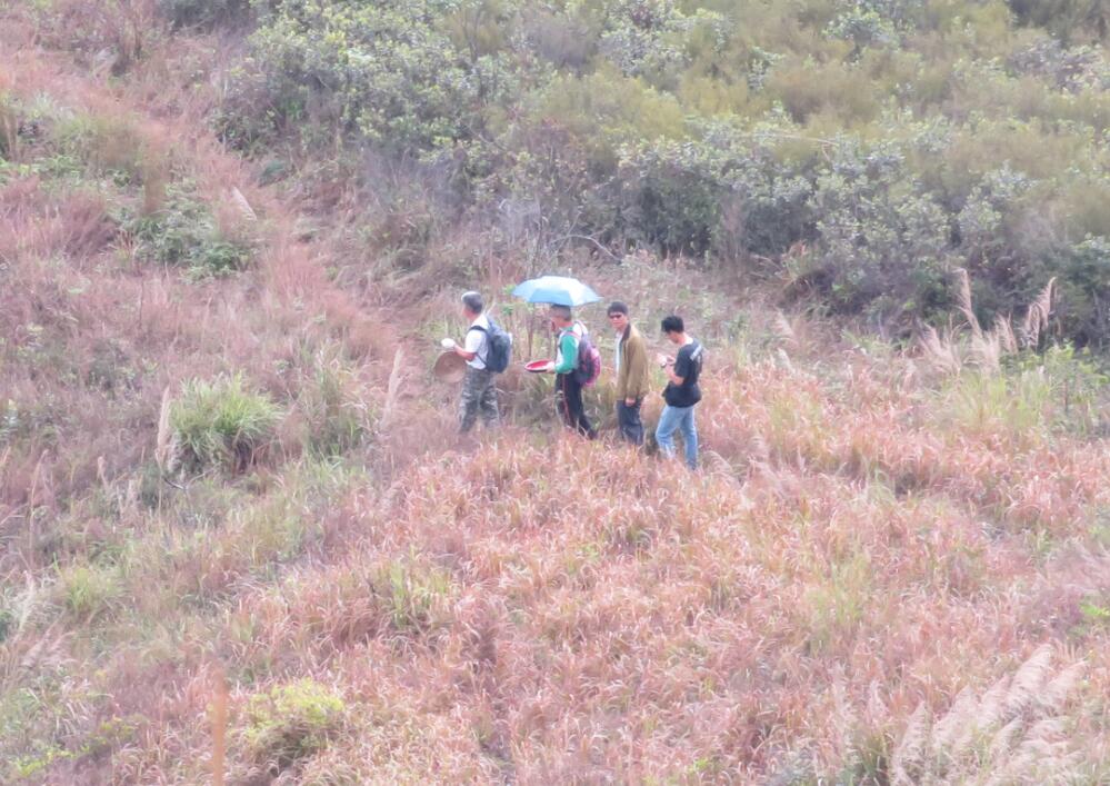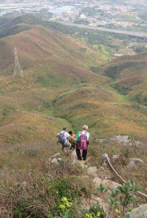 圓頭山,村民稱大頭山,海拔375米高,它又稱靈渡山,其東北麓的靈渡寺,已有1500多年歷史,為香港古剎之一,可見為風水寶地。村民約9時20分在神棚起步,經亦園路進入往圓頭山的山徑。山路初段還好走,因為電力公司在半山腰起了電塔,為方便維護,約30年前已建了石級路。但走了約半小時,就進入碎石砂路,周圍長草叢生,近山頂一段50、60米路更為陡峭崎嶇,有好心的山友多年前設置鐵鏈和繩索讓人攀扶。