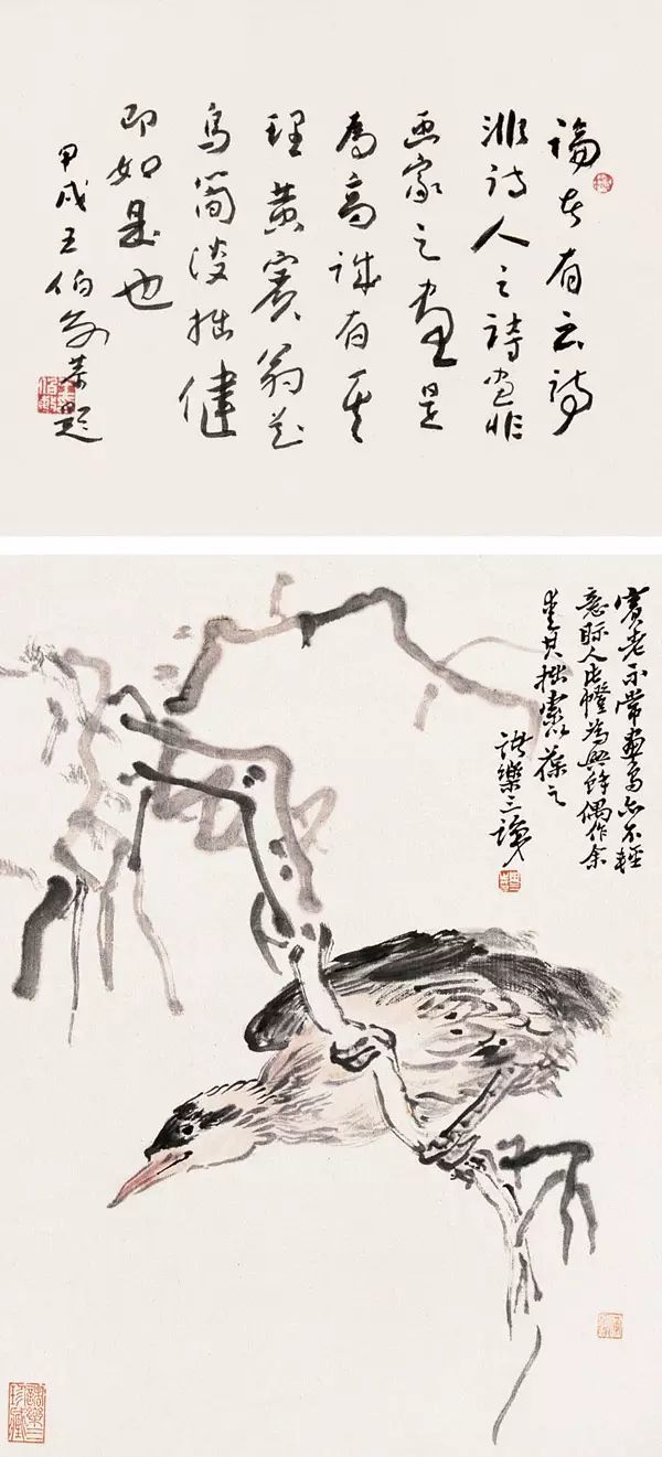 总之学中国画的画家,学书法下的工夫应该不亚于绘画,起码在学习期间是。创造期间画画可以多一点,我们说学习期间,书法和绘画的下力气至少应该平均。中国绘画尤其写意画,如果有捷径的话,就是练字,我的画一般人说好,我开始听了很高兴,后来我听多了也不怎么高兴,我觉得一个正确的批评是很难得的,有人批评得好,就是骂我我也要听。有的人说我的画意境很好,文气也不错,但是就是太弱了,讲我画弱的这个人名气不大,我非常感谢他。后来我给他寄了很多书,我觉得他这话很有道理,后来我就练字,开始写石门铭,回头再看就意识到了。你看墙上挂我这几幅画就比以前浑厚了,练字后马上功力就不一样了,所以练书法就是绘画的捷径。