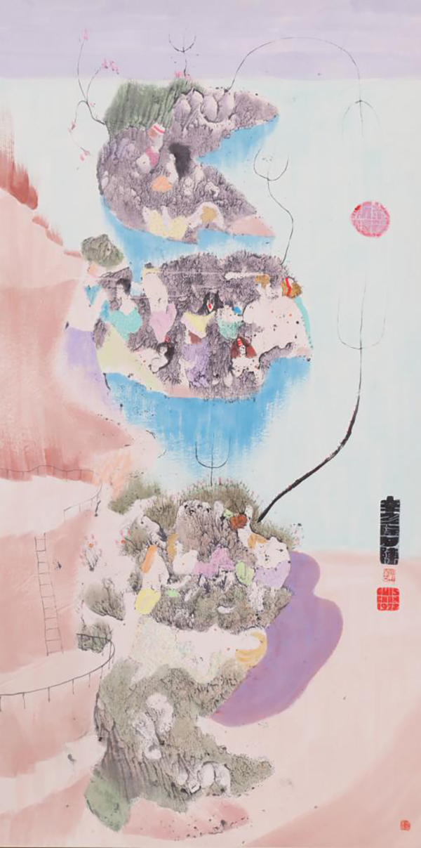 以作品《新年》为例,画的是他的“新年”,和我们平时印象中的“新年”没有任何联系:上下两座岛,山石里会出现人头,只有脸,没有身体,非常梦幻。在他的画里,树能长在水里,陆地可能在天上,颜色常常比现实要鲜艳得多。他生长在香港,接触的是香港的山、水、人、鱼,画里也多是这些元素,像《新年》这样的画就是他对当时香港的感觉。
