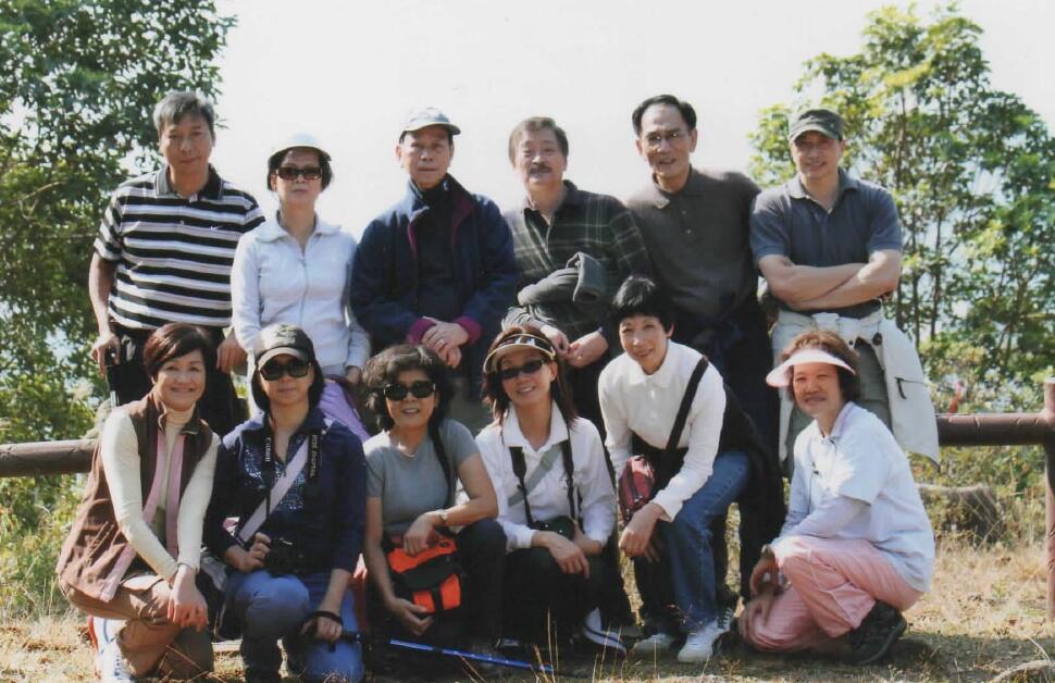 劉皇發(後排左三)像父親一樣,教文富穩(後排左一)如何建立人際關係、處理鄉郊事務等。圖為他們在大帽山行山時與同行者留影。