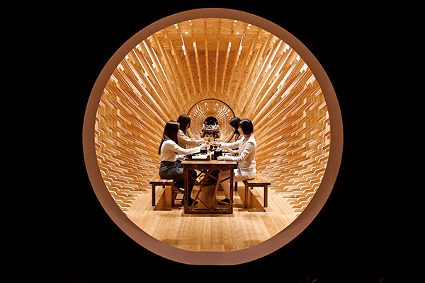 參觀者更可選擇置身裝置中,一邊靜思一邊享受獨特的進餐體驗。酒店的行政副主廚博雅維本就奉行「少即是美」的烹調之道,與「禪」的思想不謀而合,是次以該裝置為靈感設計出帶有「禪風」的菜單。如主菜中的「A5鹿兒島和牛西冷配雜菜伴燒汁」和「慢煮三文魚配魚子醬及雜菜伴白酒牛油汁」,博雅維表示:「木材令整個空間主調呈黃色,所以在兩款主菜內用上黃甜菜作搭配。」除了裝置的顏色延伸至食物內,他還特地採用來自日本高低不一、黑白分明的餐具,塑造出中國陰陽學說的風格,貫徹「禪思」。恍如禪茶般,借茶悟道,筆者認為,在這般特殊的空間和菜式,借助食物同樣能悟道,與志同道合的朋友進行一場心靈的沐浴。
