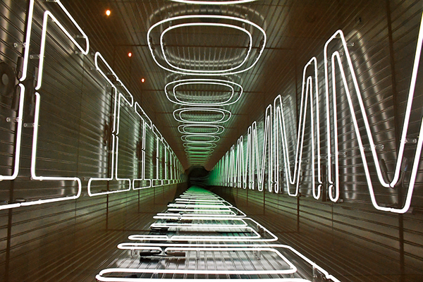 在作品《HOME》內藝術家將「H」、「O」、「M」、「E」四個霓虹燈字母置於大木箱內。
