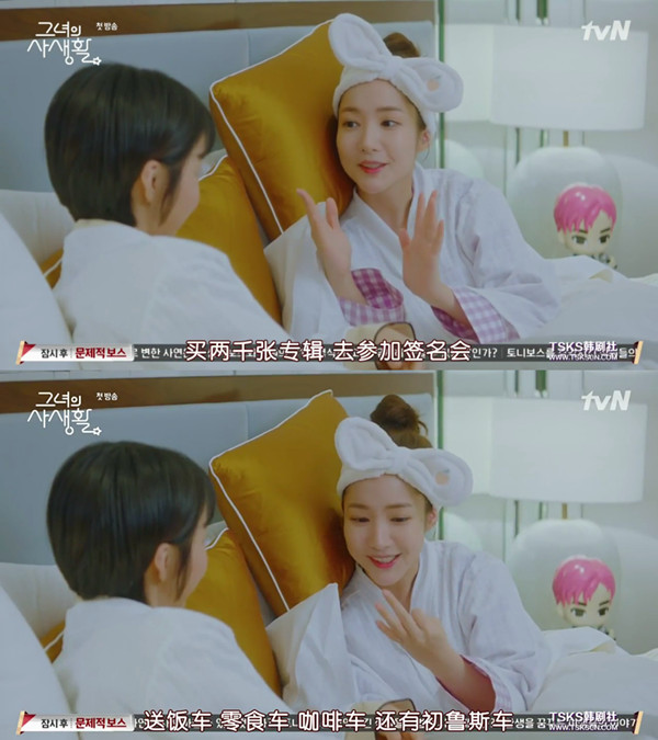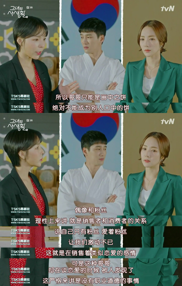 由朴敏英、金材昱主演的tvN水木剧《她的私生活》,改编自网络小说《姐姐粉丝.com》,可以说是一部高配版《首尔站姐图鉴》《致我们追星的小时光》。成德美(朴敏英饰)在外是一间小美术馆的首席策展人,在家里却是名副其实的追星宅女+小鲜肉的大站姐,Ryan Gauld(金材昱饰)则是这间因卷入社会新闻面临关门的美术馆的新馆长。两人因一幅美术作品结缘,成德美在机场跟拍爱豆时又与Ryan发生了争执,并遗失了追星手帐本,隐藏了20多年的迷妹身份,也因为Ryan的到来可能被揭穿。