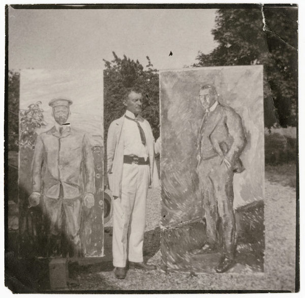 爱德华·蒙克与两幅作品在室外,摄于1909年。