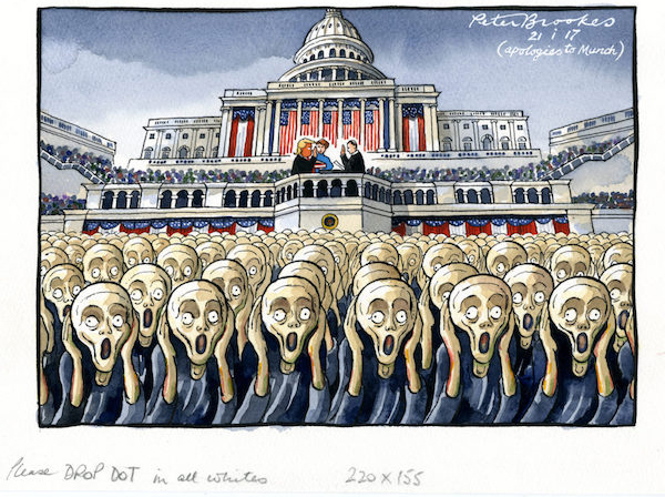 从安迪·沃霍尔到日本漫画,再到好莱坞电影,《呐喊》逐渐超越了艺术史范畴,成为流行文化的灵感源泉,对现代视觉文化有着重要的影响。上图是英国艺术家皮特·布鲁克斯以《呐喊》为基础,创作的讽刺川普就职美国总统的漫画,并于2017年发表在《泰晤士报》上。