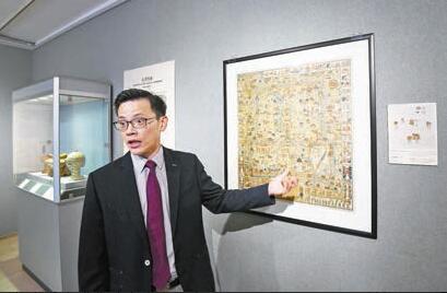 另外,展覽中有一件乾隆年製的藍綢龍袍,此袍繡九龍紋及十二章紋。姚進莊指,龍袍一般為金色,祭典由於是向天祈福,故為藍色,歷史上冬至時,皇帝藍地龍袍至天壇祭祀,春日至祈年殿祈求豐年,夏日則祈雨,如仔細留意,龍袍上的金線不僅得一種金色,而是有紅金、紫金等不同顏色,手工十分精緻。