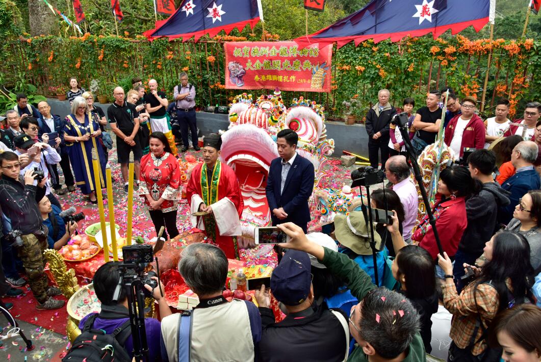 大金龍在筲箕灣關帝廟舉行開光儀式,龍頭前站立者,右起:許嘉雄、喃嘸師傅陳鈞、金龍博物館館長Anita Jack。