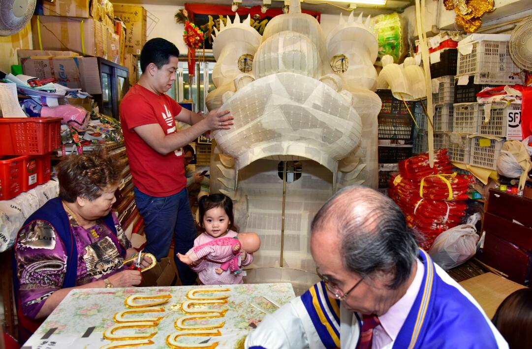 三代人參與製作金龍,許嘉雄在紮龍頭,父母在一旁做麟片,最小的女兒前來打氣。