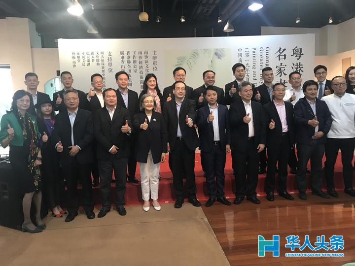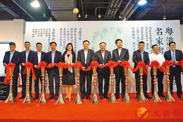 「粵港澳大灣區名家書畫展」在南沙開幕,賓主一同剪綵。