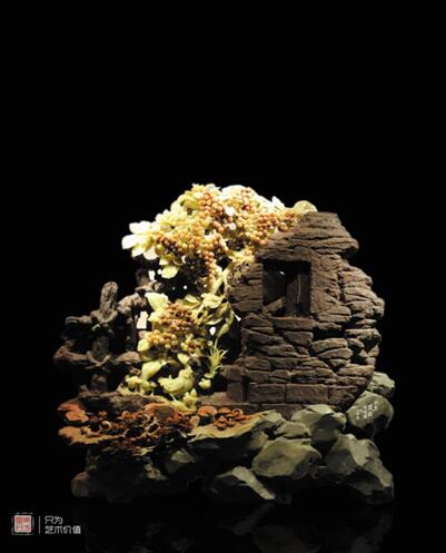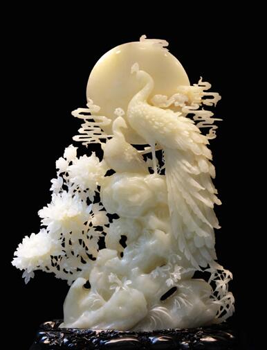 另有高级工艺美术大师谷龙宝阿富汗粉冻石作品《富贵长寿花果篮》(168×33×195cm),质纯而微透,名石佳作,相得益彰;高级工艺美术大师彭胜坤昆仑玉作品《孔雀牡丹屏》(130×50×213cm),质地细润、淡雅清爽,表现传统的吉祥图案更为典雅。