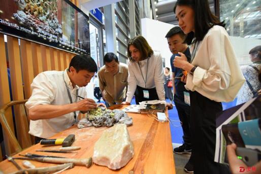 图为浙江省工艺美术大师姚光甫在第十四届文博会东方国石展区现场展示青田石雕技法 图:深圳特区报-读特记者 胡蕾