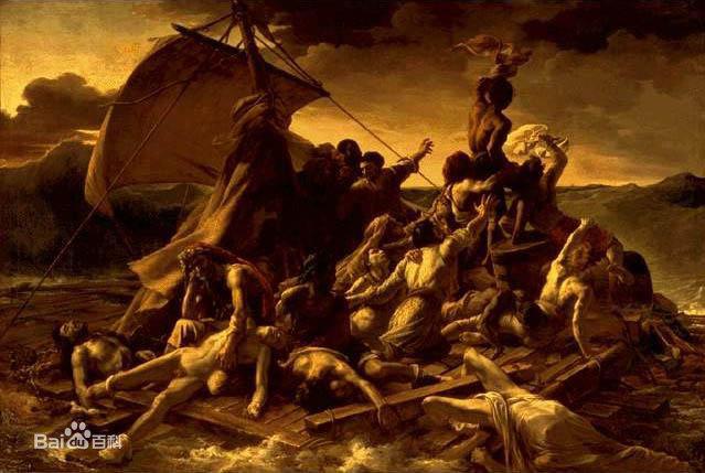 《梅杜萨之筏》,大海上漂浮着一只岌岌可危的木筏,海风鼓起床单做的桅帆,巨浪掀起的木筏在不停地颠簸。筏上的难民有的已奄奄一息,有的还在眺望远方。被托举在高处的人挥舞着手中的红、白色布巾,不断地向远方呼救(图:百度百科)。