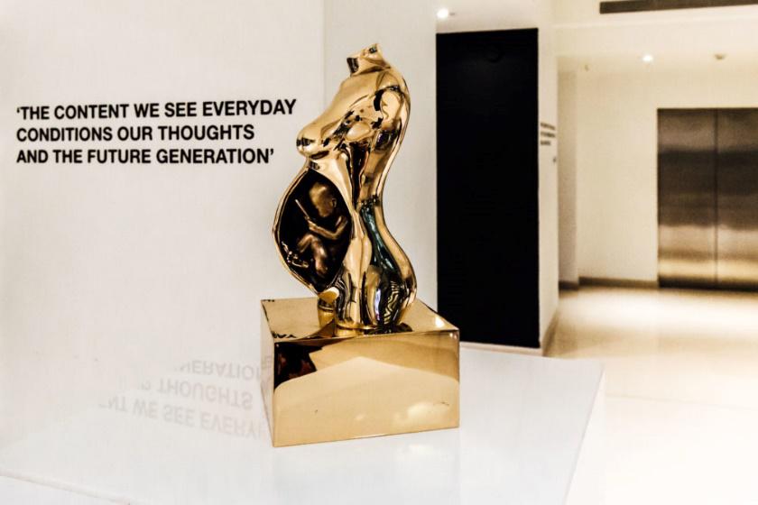 墙上文字:“每天看的东西决定了我们的思想和我们的后代”,图片来自“饥饿”(HungerTV)时尚杂志。