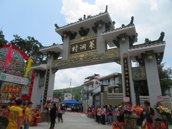牌樓豎立在萊洞村村口,揭幕儀式於16日上午約11時半開始,出席主禮嘉賓包括鄉議局副主席林偉強,沙頭角區鄉事委員會主席李冠洪、副主席李炳華及曾玉安,萊洞村村長鄧齊和,北區區議員溫和輝,以及土木工程拓展署、民政事務署、警務處及地政署等政府部門代表。