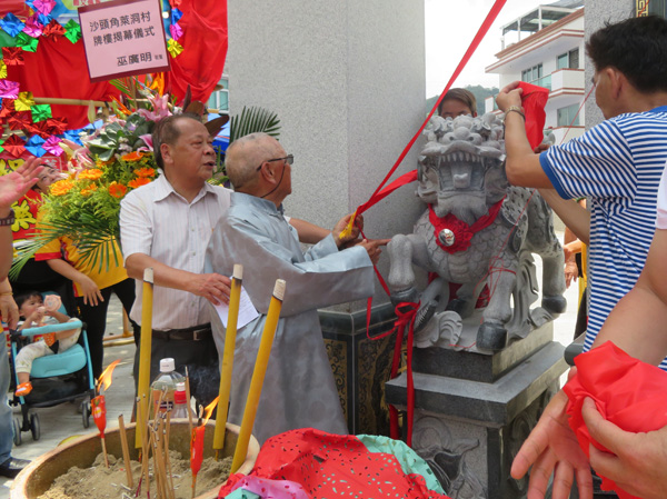 村長鄧齊和與長老(左一及二)為石獅子拉開紅布。