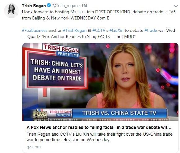 翠西也意识到了自己弱点,在辩论前夕,还特意转发了一篇题为《福克斯主播准备在与中国同行的贸易战辩论中摆事实》的报道,并且强调,这场前所未有的辩论中,将证明自己“事实胜于雄辩”(sling facts, not mud)。
