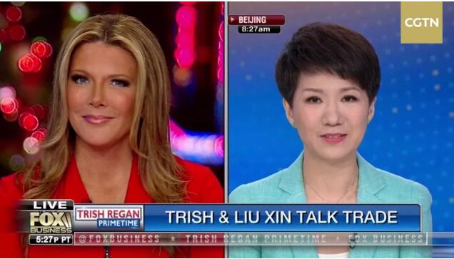 北京时间5月30日早上8时20分(美东时间5月29日晚8时20分),中央广播电视总台中国国际电视台(CGTN)知名女主持人刘欣应美国福克斯商业频道(Fox Business)女主播翠西·里根(Trish Regan)邀请,与其就中美摩擦等相关议题进行一场面对面、直击焦点的“跨洋对话”。双方就公平贸易、知识产权、华为、关税、中国发展中国家地位以及美方所谓的“国家资本主义”进行了长达16分钟的对话。
