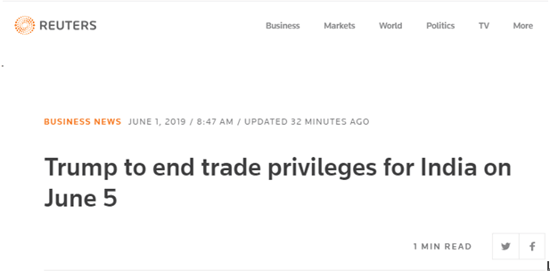 特朗普今年3月就曾宣布,打算将印度从普遍优惠制(Generalized System of Preferences,GSP)待遇国名单中移除。