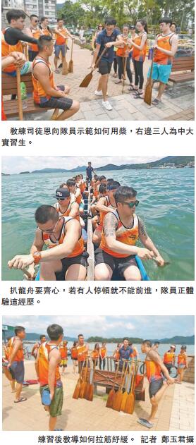 記者在最後一堂「觀課」,這日(6月2日)天公造美,湛藍天空飄白雲,青龍隊一行22人,包括Sir、教練司徒恩、17名戒毒人士、3名中大實習生(來自音樂系、建築系及中醫系),在碼頭邊細聽教練指示後,即拿木槳坐進狹長龍舟,緩緩划離碼頭,向大環村及早禾坑一帶西貢海域進發。因安全問題,記者未能隨船,只在岸邊遠看。此時熾熱陽光灑遍大地,然隊員不懼烈日,只見他們在海上停頓一會後,即奮力划槳,龍舟如箭極速向前數十米;隊員一時又如大頑童,槳拍水面,或將水撥向隊員,大家玩得興高采烈。
