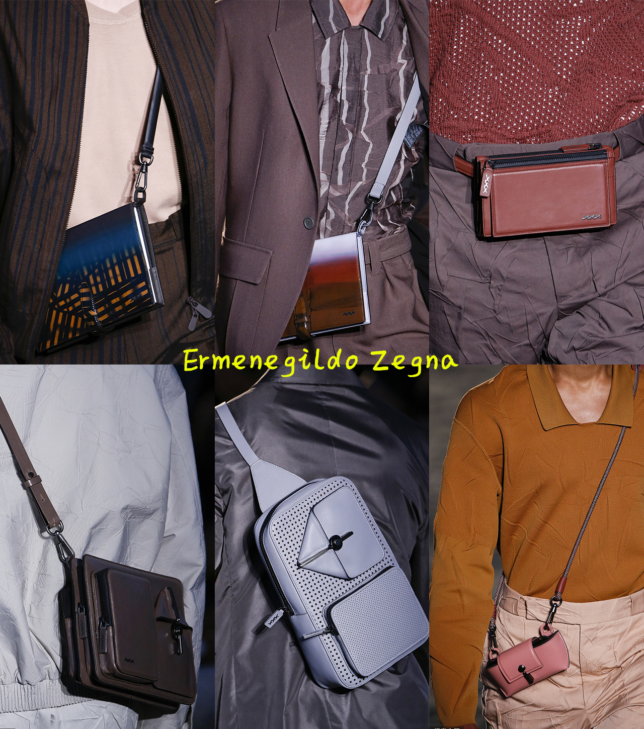 而Zegna依旧是在商务熟男的基础上做了很多改良,注入了很多年轻的元素,比如线条硬朗的小挎包、细带腰包、和暗粉色小背包等等,打破了一向的商务印象。