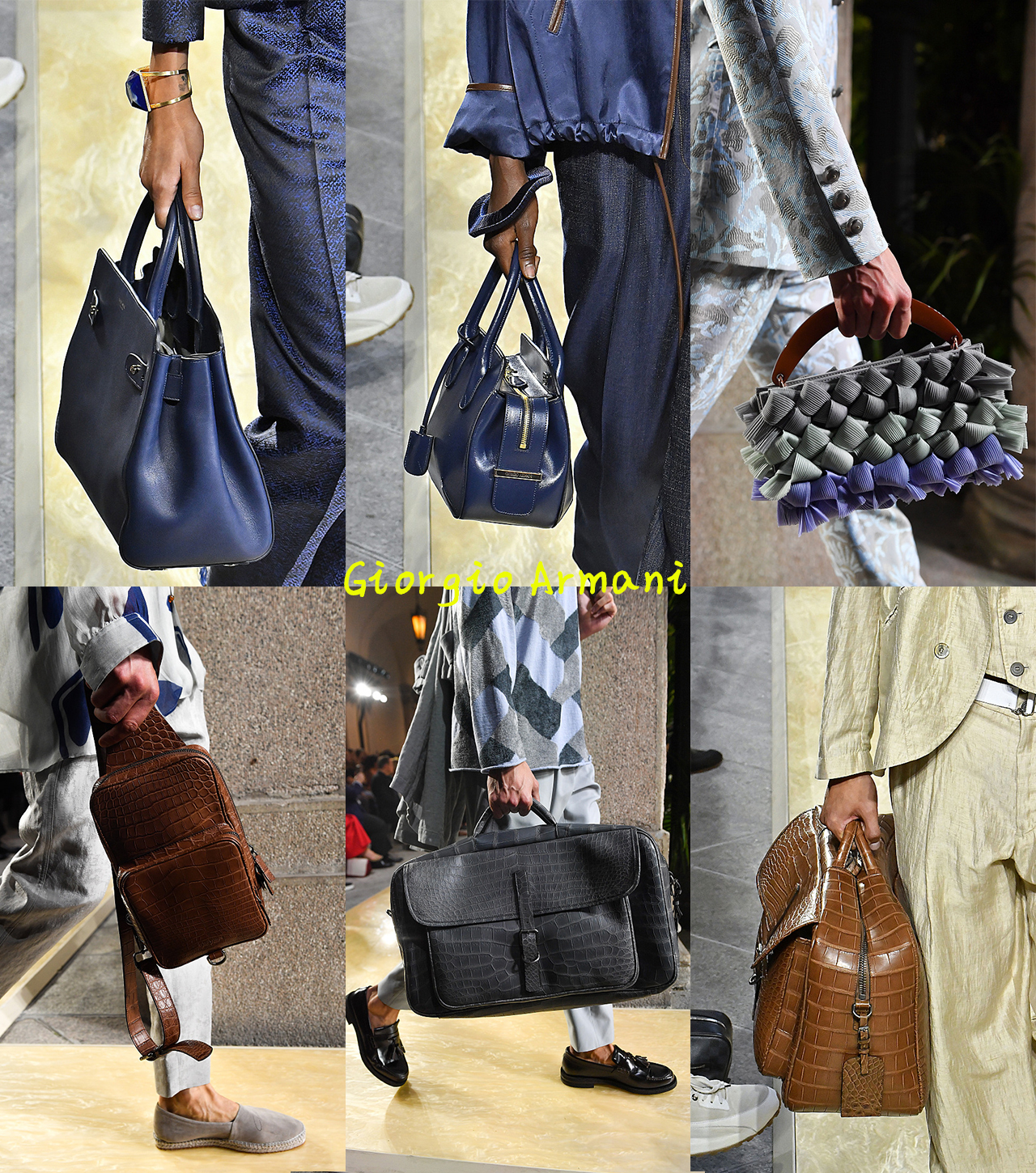 Giorgio Armani走的依旧是稳重熟男路线,主打深蓝色,鳄鱼纹的手袋带也是满满的商务范儿,对于西装范儿的商务男士来说,是个不错之选。