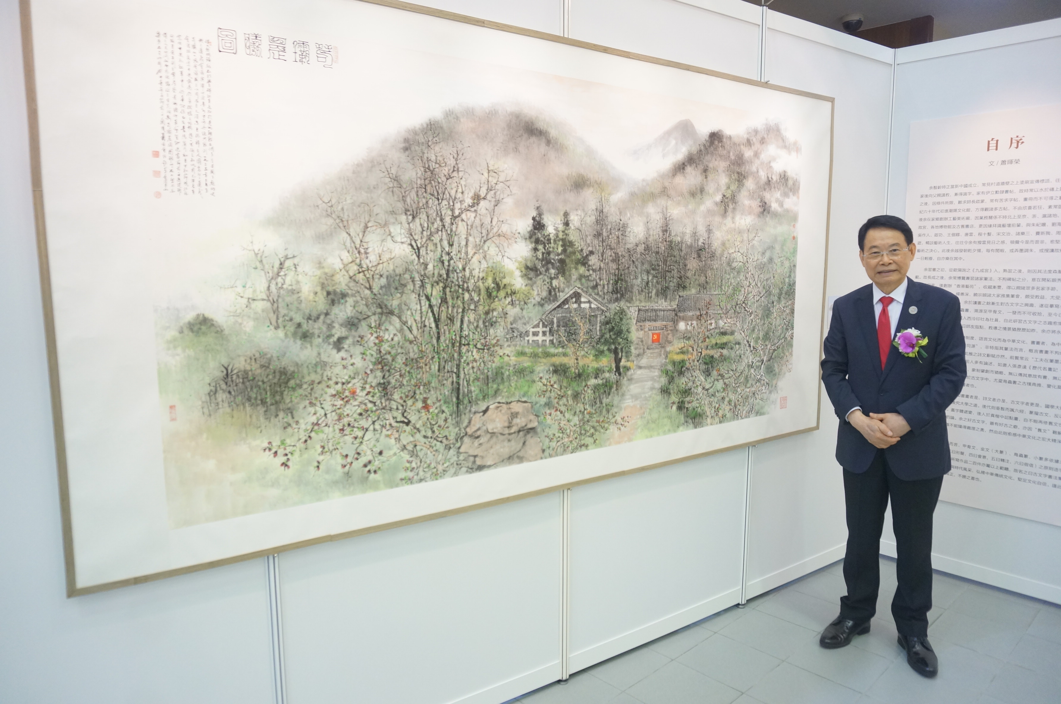 此次展覽特別展出《苟壩晨曦圖》,是蕭暉榮年初在貴陽視察,進行寫生的時候所畫,他向本報記者透露:「中間的紅旗是萬綠中的一點紅,象徵沒有共產黨便沒有新中國,特別慶祝祖國成立七十周年。」