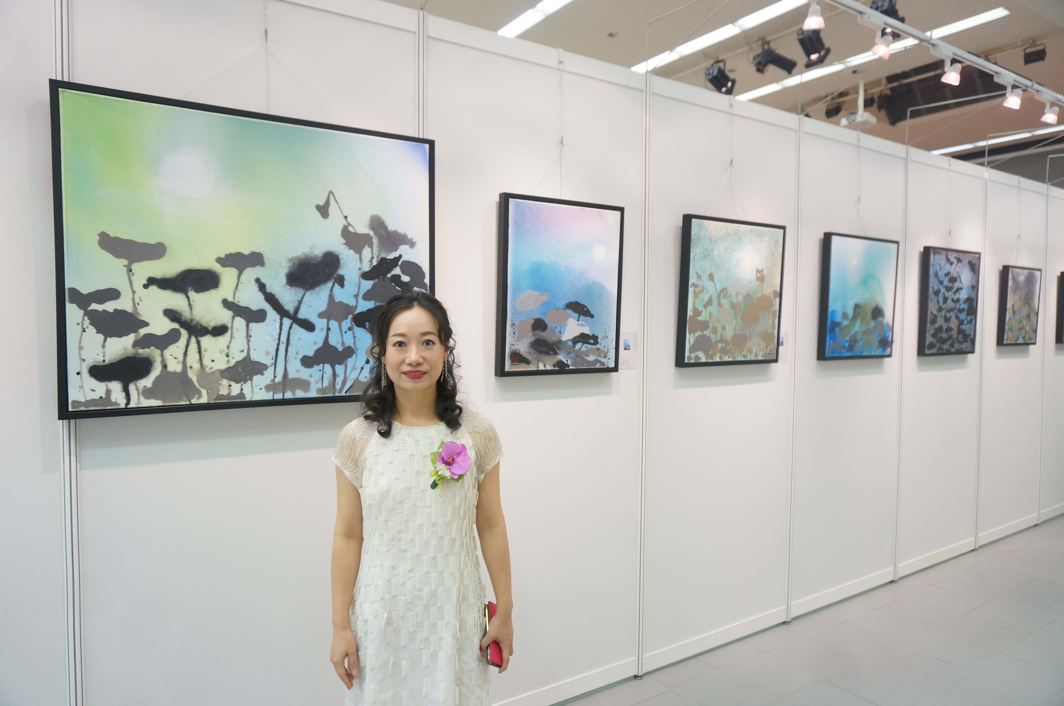 蕭芬琪與她的作品《荷塘月色》系列。(Karena攝)