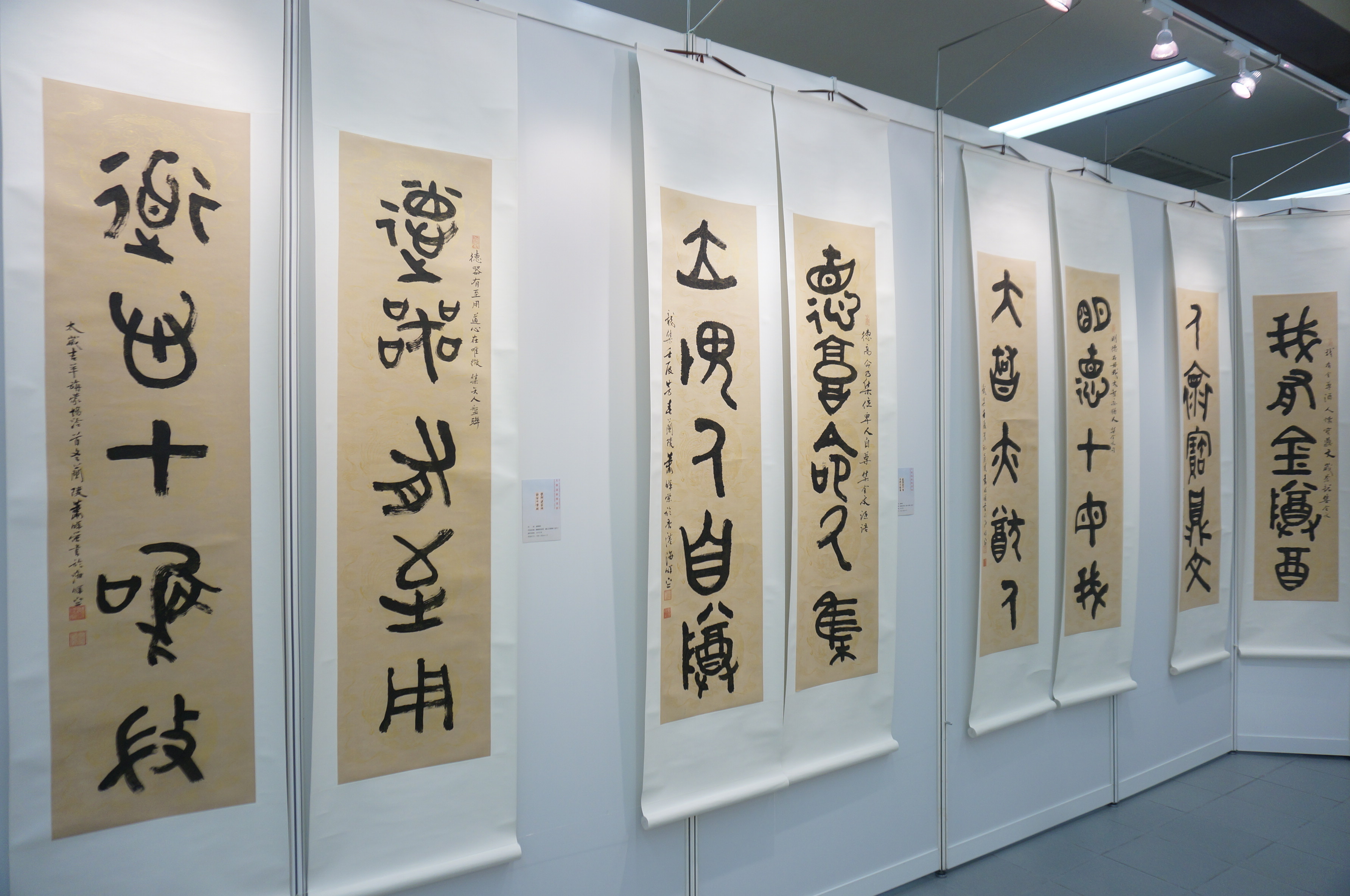 這次的展覽以古文字為主,涵蓋了甲骨文、鳥蟲篆、金文、篆書等古文字書體,當中的鳥蟲篆書取自古法並加以變化,如《一帶一路鳥鳴花開》、《精誠所至金石為開》等作品,筆劃蜿蜒盤曲,首尾或作鳥形,或作蟲形,或作花卉,富有逸趣。