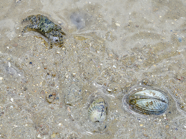 沙洲上見空蜆殼(圖右),亦有少量食草蟹(圖左)在沙中爬行。
