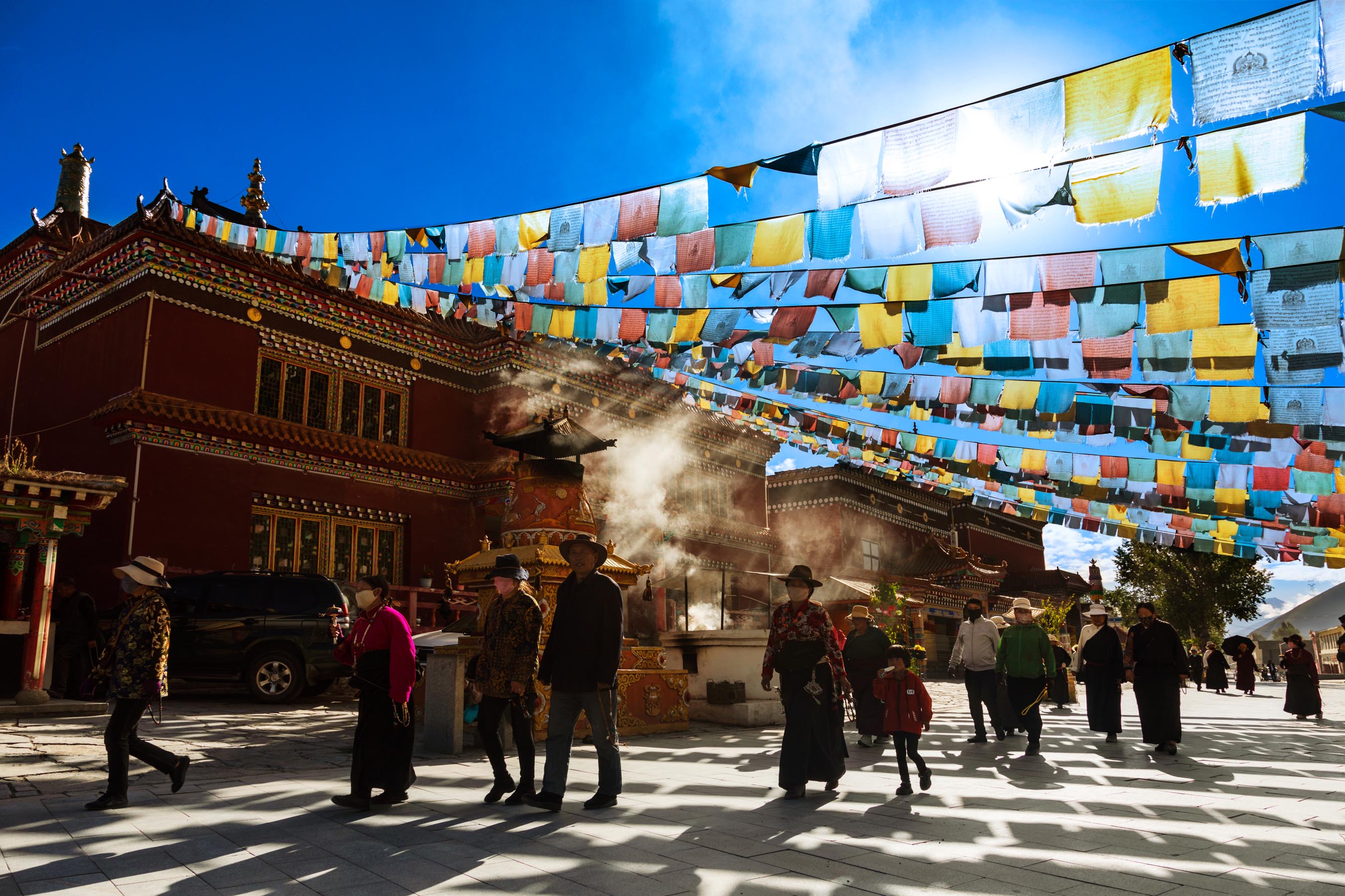 新寨嘉那嘛呢城寺廟附近,陽光透過五彩經幡投射到瓊龍路之上。(李秀恒攝)