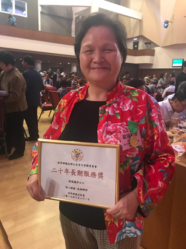 歐陽鳳珍是香港首名女村長,圖為2017年她獲鄉議局婦青會頒發20年長期服務獎。 (本報資料圖片)