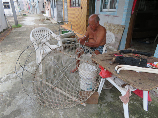 71歲的馬金木退休後回滘西村做漁民,這個魚籠是他親手做的。
