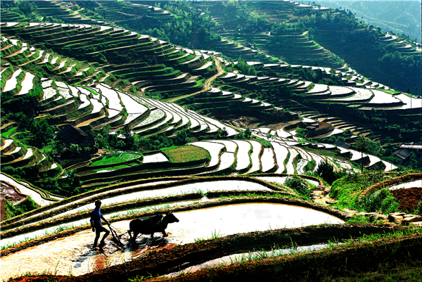 山背花瑤梯田,傳統的牛耕,質樸的農人