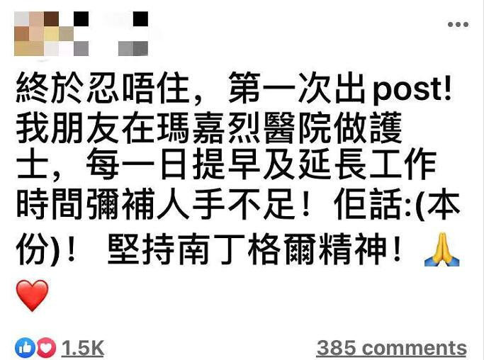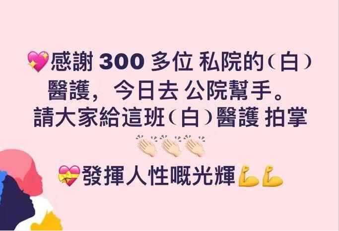 但在罷工不斷升級的情況下,本港仍有眾多醫護人員堅守崗位,抗擊疫情。不少醫護人員在社交媒體上發佈醫護同事堅守崗位的言語及相片,令眾多市民感到欣慰。