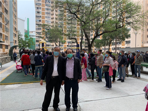 張廣勇(右)與滬港校友聯合會主席單志明(左)於「齊心抗疫義派口罩」活動中,為二千多名市民送上口罩,街坊聚成長龍等待領取。