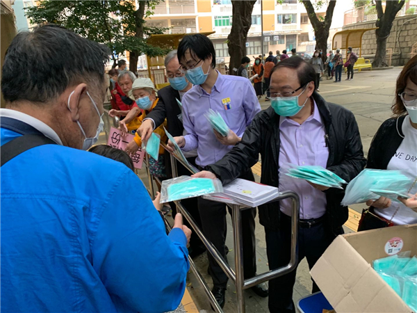 張廣勇贊助了「齊心抗疫義派口罩」活動並在馬頭圍為街坊送上口罩。