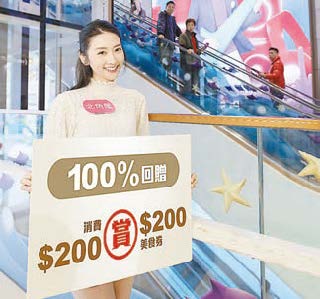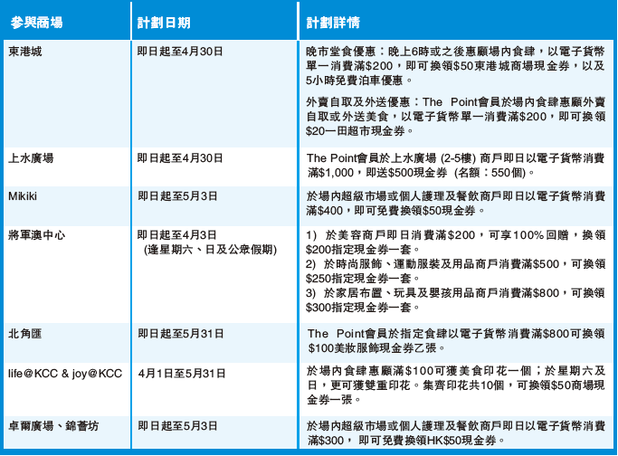 食肆外,多個商場亦推出零售優惠,上水廣場推出消費回贈高達50%的優惠;北角匯商場即日至5月31日推出Keep Rewarding 100%循環賞,以電子貨幣消費滿200元,可獲贈200元指定食肆現金券乙張。
