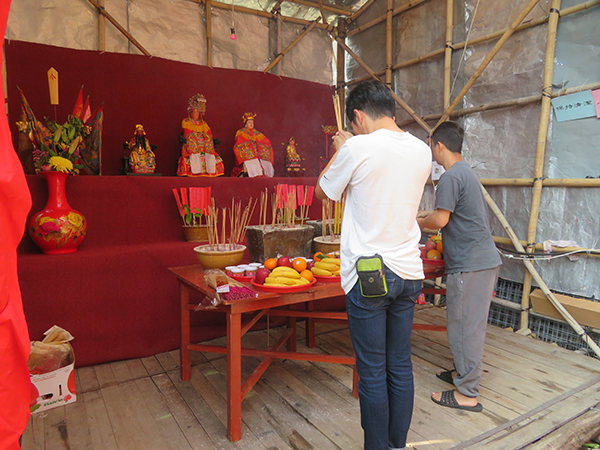 村民拜祭臨時神棚內神像,塔門天后及鹽田天后(左二及左三)、關帝(左一)及觀音(右一)。