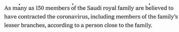 另据美国《纽约时报》9日爆料,该报称,据一名与沙特王室关系密切的人士透露,据信多达150名沙特王室成员感染了新冠病毒,其中也包括王室那些较小分支的成员。