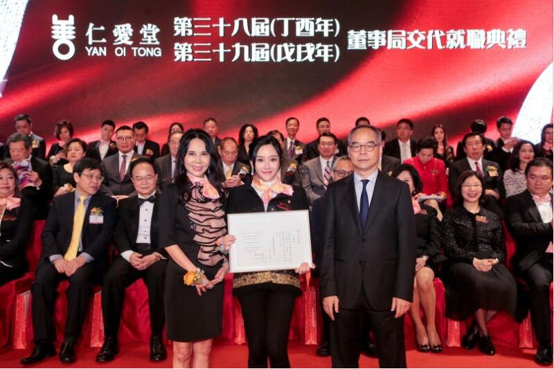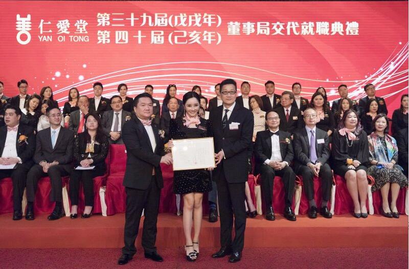 鄭慧賢(中)獲民政事務局副局長陳積志(右)及仁愛堂主席連卓鋒(左)頒發第四十屆仁愛堂副主席選任證書。