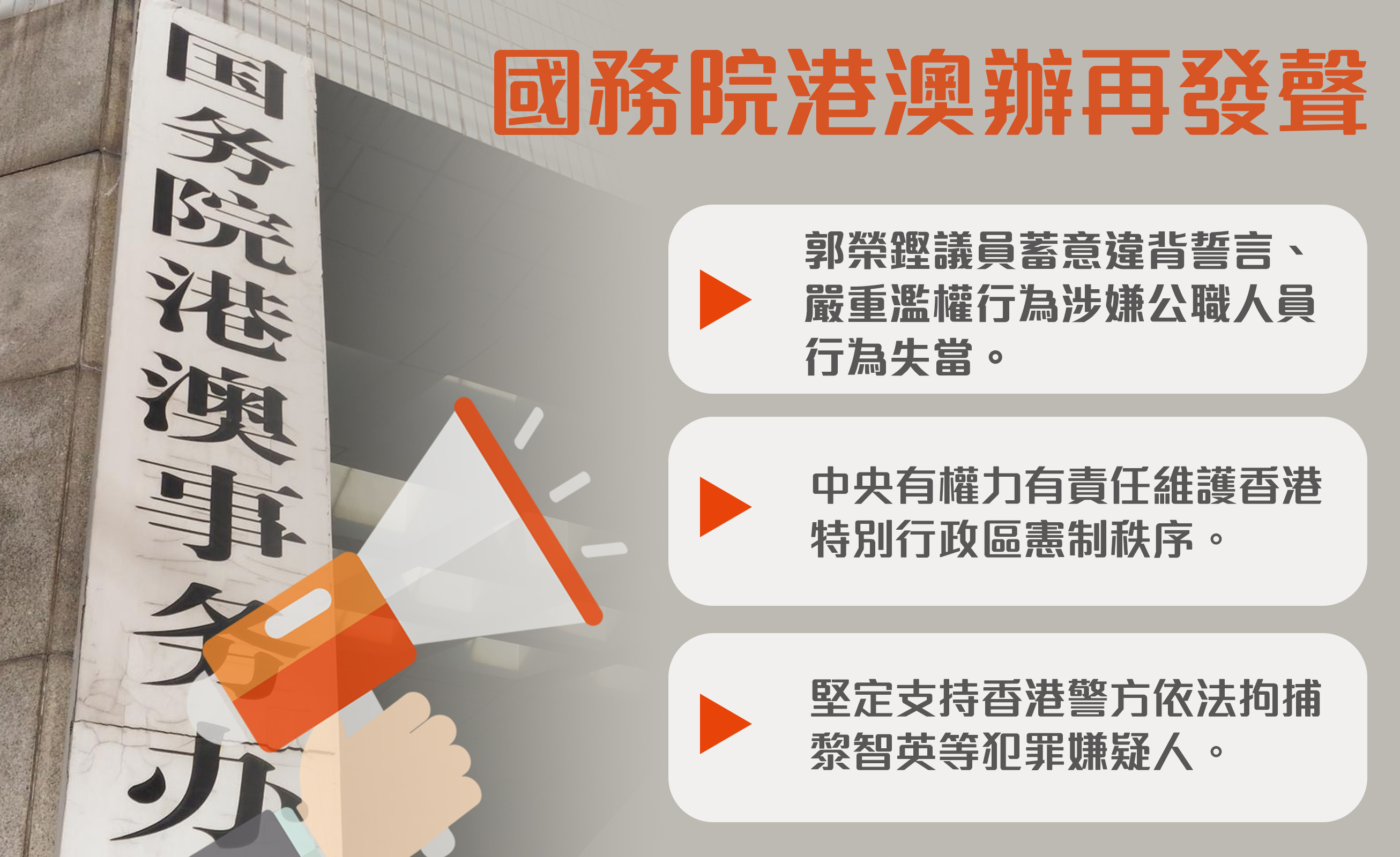 在香港,每當中央依法行使權力時,總有一些人鼓譟「中央干預香港自治事務」。我們倒要問問這些人:當黎智英公然叫囂「為美國而戰」的時候,你們怎麼不出來表示一下反對?當黃之鋒一夥把香港特區政府民政事務專員的名單交給美國人,乞求他們給予所謂制裁的時候,你們怎麼不出來表示一下反對?就是這位郭議員本人,還跟隨李柱銘等跑到美國去乞求通過《香港人權與民主法》以干預香港事務,並對美國政客的干預行徑感激涕零,聲稱「如果要外國人一方面在香港投資,另一方面對香港事務噤聲,是不可能的」。由此可見郭榮鏗以及郭榮鏗之流的政治本性,他們反對的是中央依法行使對香港的管治權,歡迎的是外部勢力的非法干預!他們企圖用香港的高度自治權來排斥中央的全面管治權,進而把高度自治變質成為完全自治,把香港變成獨立或者半獨立的政治實體。這純屬癡心妄想!中央有足夠的誠意和信心確保「一國兩制」方針不會變、不動搖,同時也有足夠的決心和力量確保「一國兩制」實踐不變形、不走樣。