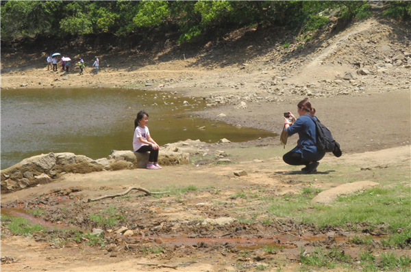 有遊人於乾涸水塘底拍照。