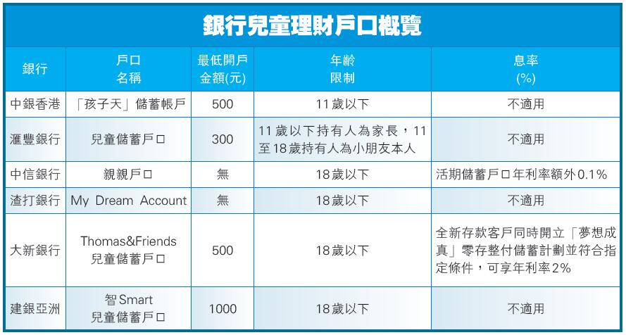 事實上,部分銀行的兒童戶口也推出較進取的息率吸客。選擇大新銀行的「Doraemon兒童儲蓄戶口」和「Thomas&Friends兒童儲蓄戶口」,只要新存款客戶同時開立「夢想成真」零存整付儲蓄計劃並符合有關條件,就可享高達2%的年利率。