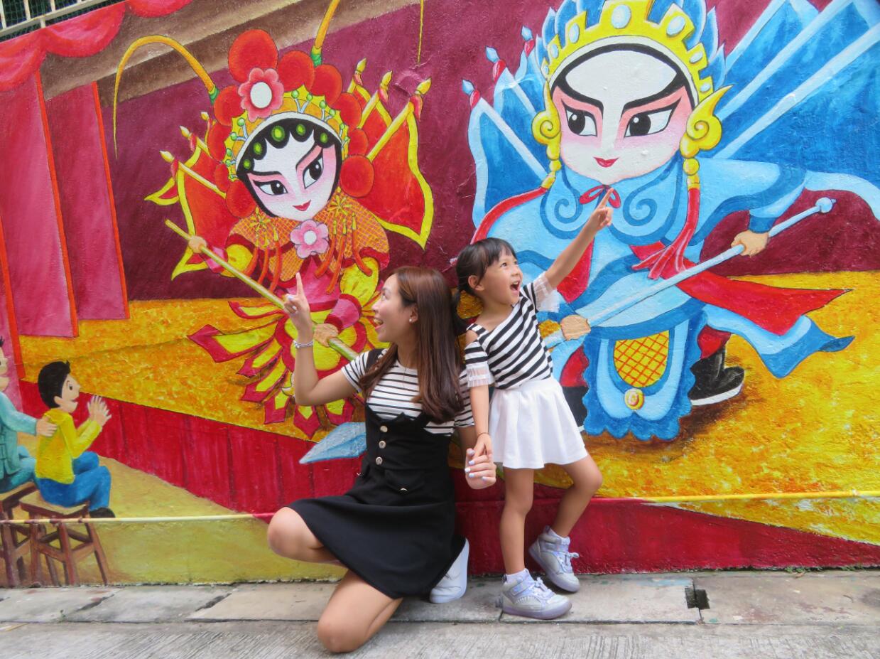 Queenie與貝貝在大澳童年壁畫前扮鬼扮馬。 記者 鄭玉君攝